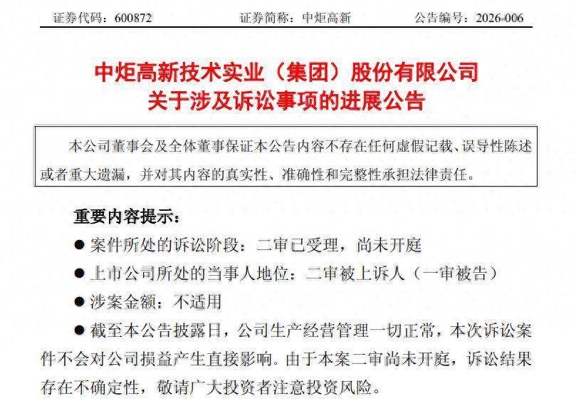 来源:公司公告公告显示,塔冷通请求撤销中山市中院2025年10月20日作出的(2025)粤20民初79号民事判决,并改判支持其一审全部诉讼请求;中炬高新作为二审被上诉人,将继续应诉。
